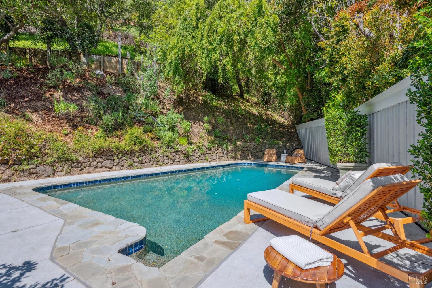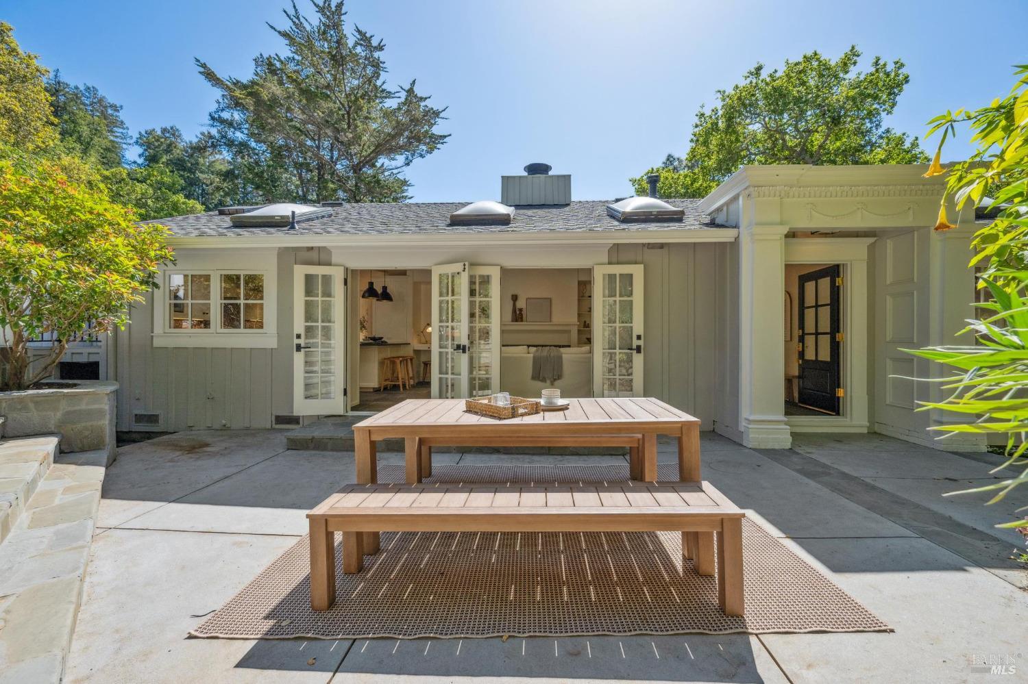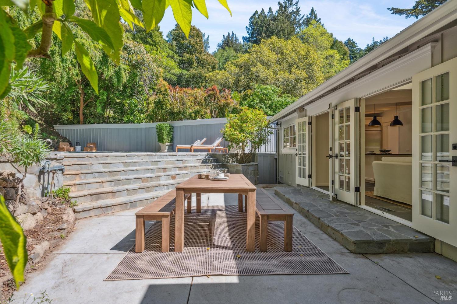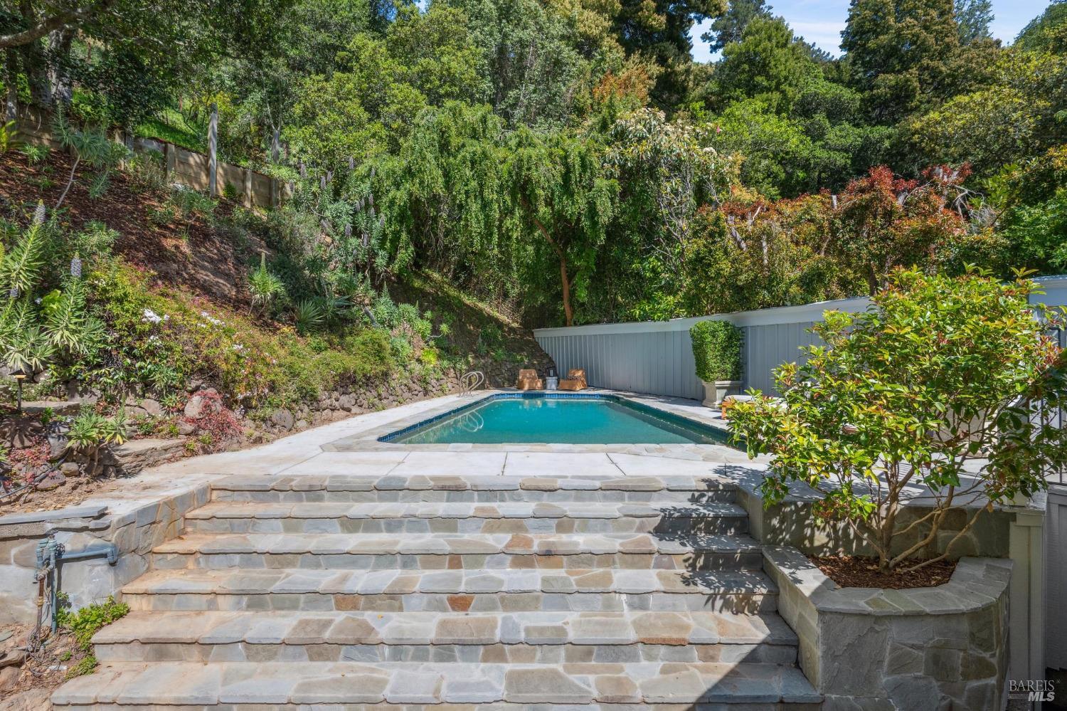 Welcome to 144 Woodbine, a sun-drenched retreat on a private half-acre lot in one of Mill Valley's most coveted weather pockets. Surrounded by majestic oaks, this beautiful 4 bedroom, 3 bath home offers the perfect blend of indoor-outdoor living and privacy. With approximately 3,397 sq.ft. (per architect) of inviting space, the home features hardwood floors, skylights, French windows, a double-sided fireplace, and built-in speakers. A stunning chef's kitchen opens to a cozy family/sitting room with French doors leading to the sunny patio, sparkling pool, and garden perfect for year-round entertaining. Beyond the pool, the backyard features multiple terraced levels of extended outdoor space. The expansive primary suite includes a walk-in closet, a private deck perched among the trees, and a spa-like bath with a soaking tub. Two additional bedrooms are on the main level, with a fourth bedroom and a media/play room with a built-in bar alcove on the lower level, ideal for guests, a home office, or movie nights. Moments from downtown and Mt. Tam trails, 144 Woodbine offers an unbeatable combination of privacy, convenience, and year-round outdoor adventure - truly the best of Mill Valley living.