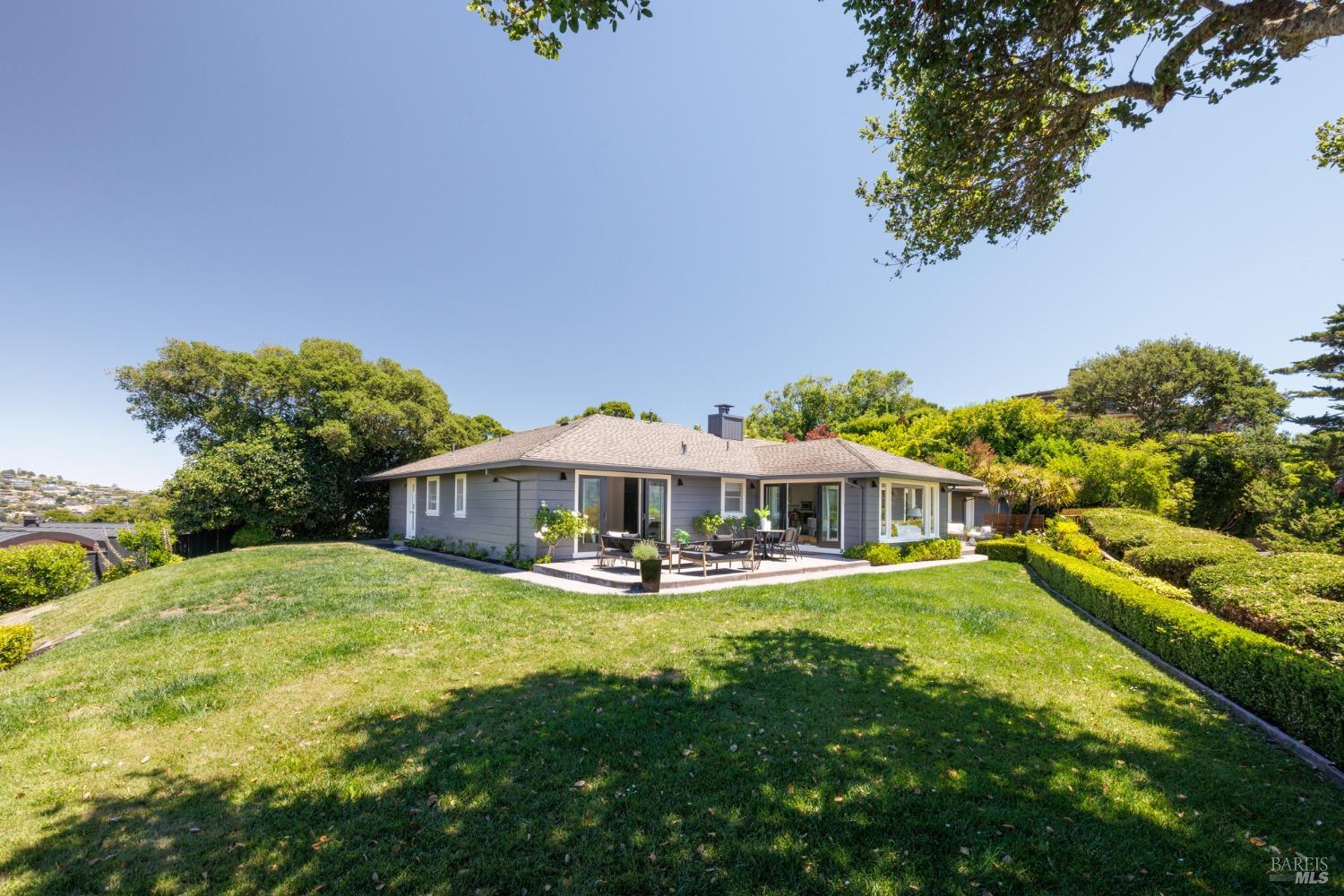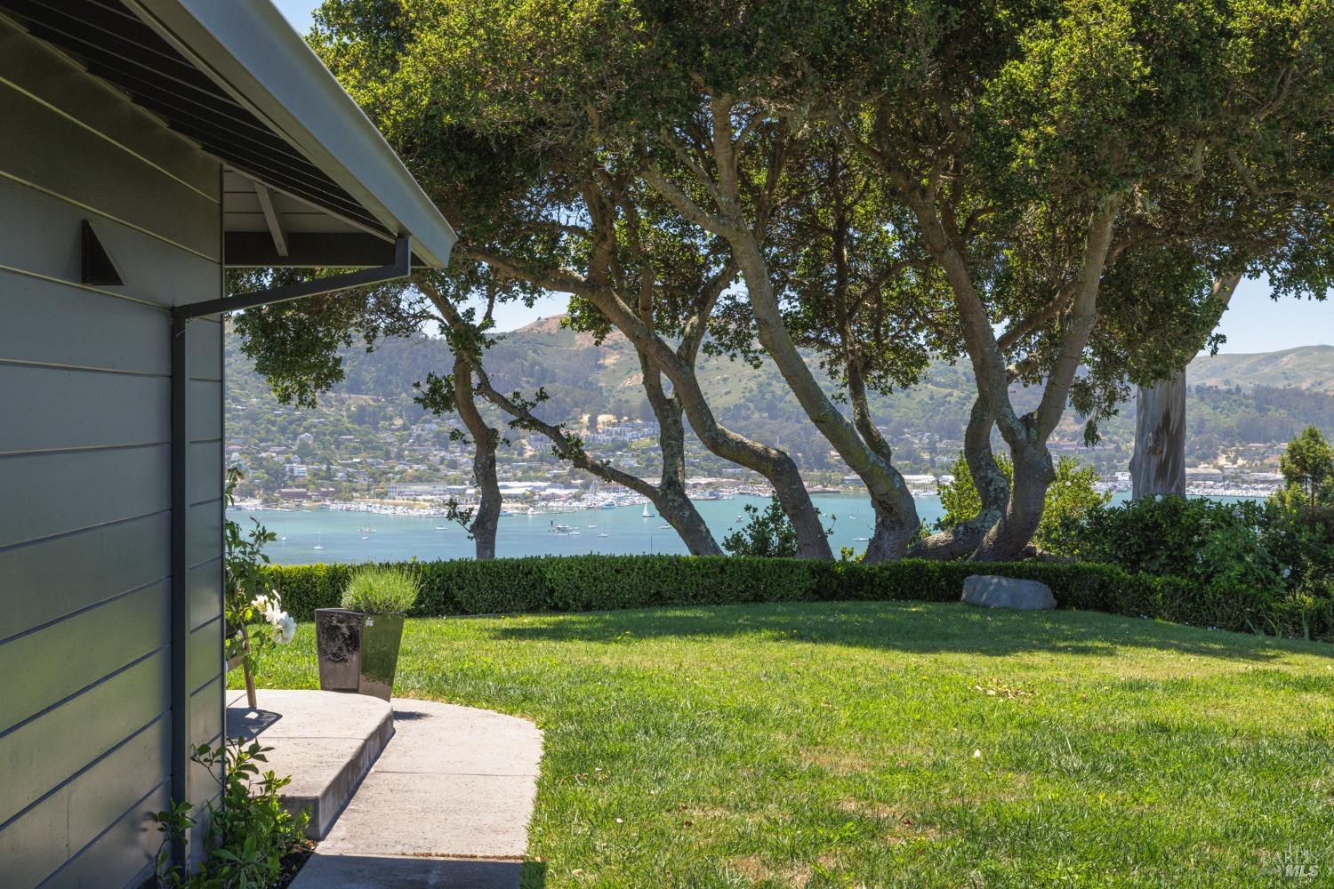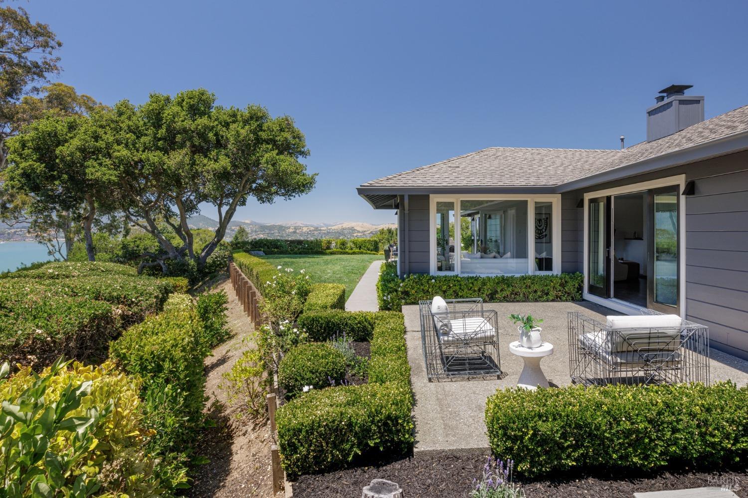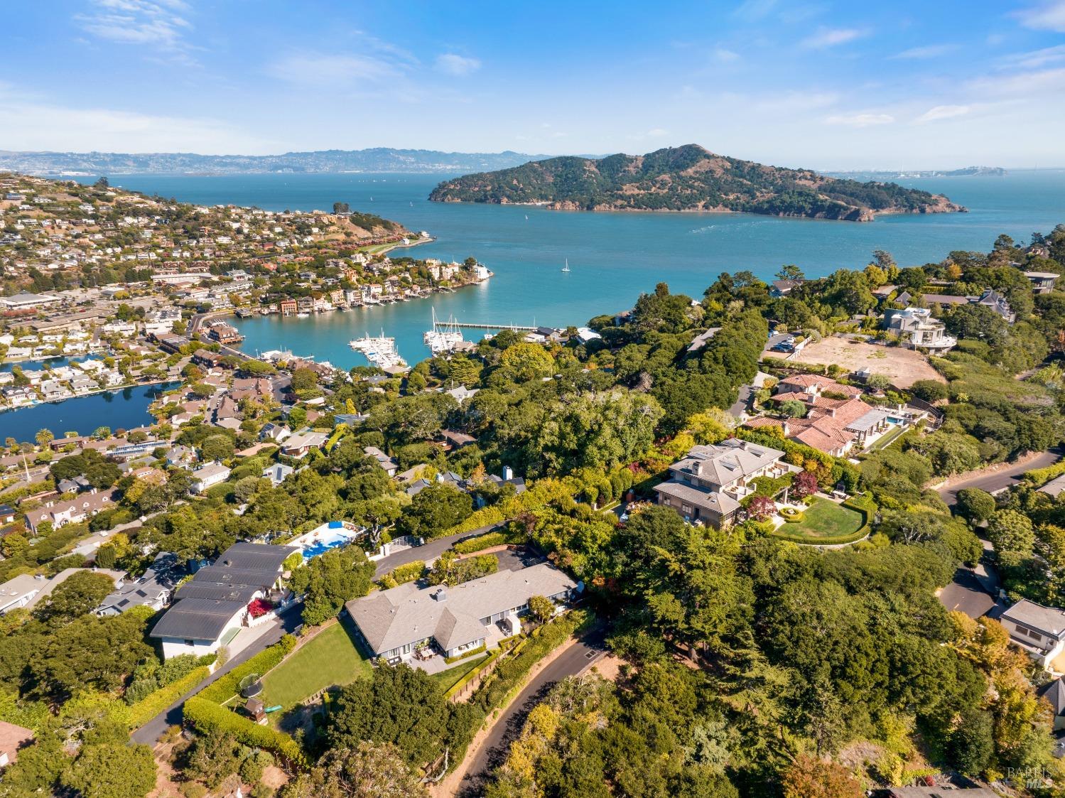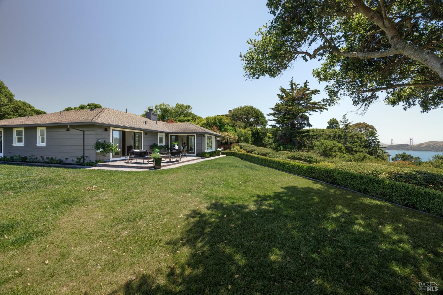 Situated on nearly half an acre on one of Belvedere Island's most sought-after west side streets, this extraordinary mid-century single-story residence boasts a level and private site, an easy layout, and sweeping views of Sausalito, Richardson Bay, Mt.Tam, the Golden Gate Bridge towers, and the surrounding vistas. The outdoor living spaces are an entertainer's dream, featuring an expansive backyard with a sprawling lawn, multiple patios, manicured landscaping, privacy hedges, rose bushes, raised garden beds, and panoramic views. This one-of-a-kind location provides an incredible opportunity to build your dream home or thoughtfully renovate the current single-level residence, with the potential for multiple ADUs. The open and airy living room features a fireplace, sliding glass doors opening to the outdoors, and oversized windows framing picturesque views. Functional and open kitchen with a center island with counter seating, newly painted cabinetry, and stainless steel appliances. Spacious family room with expansive windows offering stunning views and outdoor access. The primary suite features captivating views, a walk-in closet, 2 built-in wardrobe closets, and sliding glass doors leading to the entertainment patio. Attached 2 car garage and motor court.